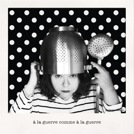 Giocando con la luce, che cambia il volto secondo la diversa angolazione, ho provato a fare qualche scatto con gli oggetti che avevo a disposizione in cucina: ho cominciato con uno scolapasta e un mestolo che poi si sono trasformati in un elmo e in un’arma grazie a Photoshop, primo strumento del mio lavoro abituale. Titolo della prima foto: “Alla guerra come alla guerra!”.